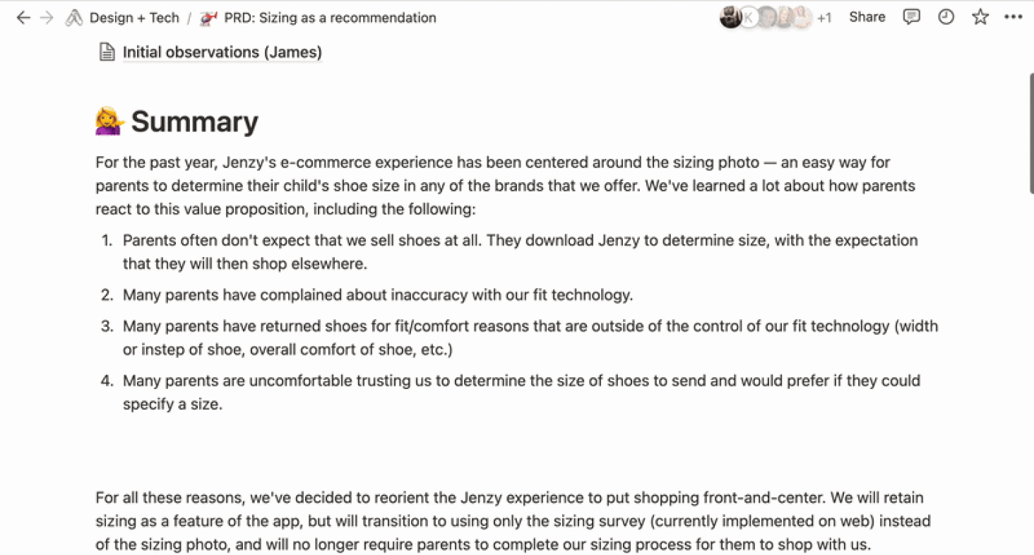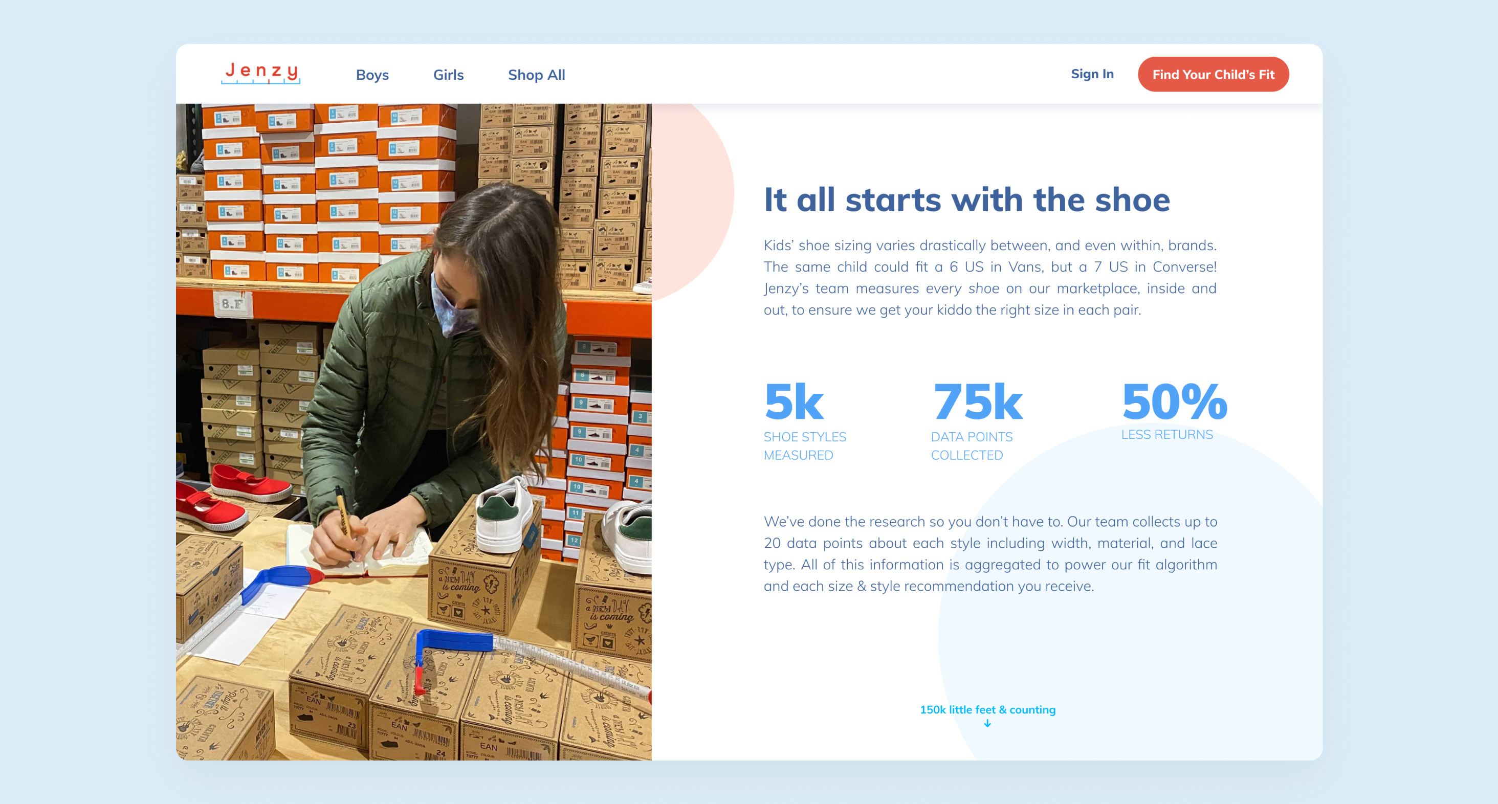 Jenzy eliminates guesswork in children's shoe shopping by providing accurate sizing across every brand and style. When data revealed that a simple fit quiz we crafted outperformed our photo scanning technology, I led the design's transition that made the quiz the core of the sizing experience.