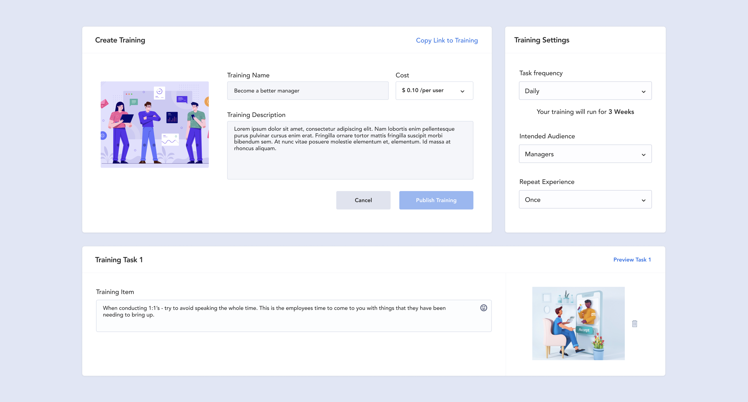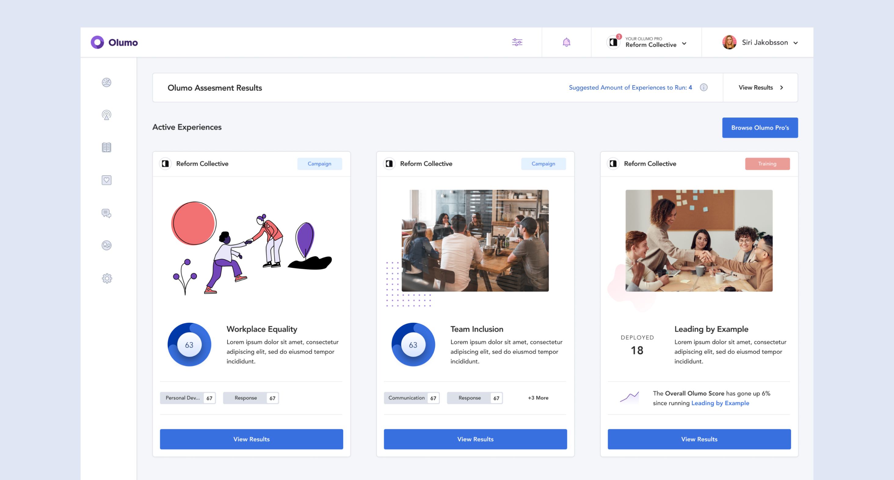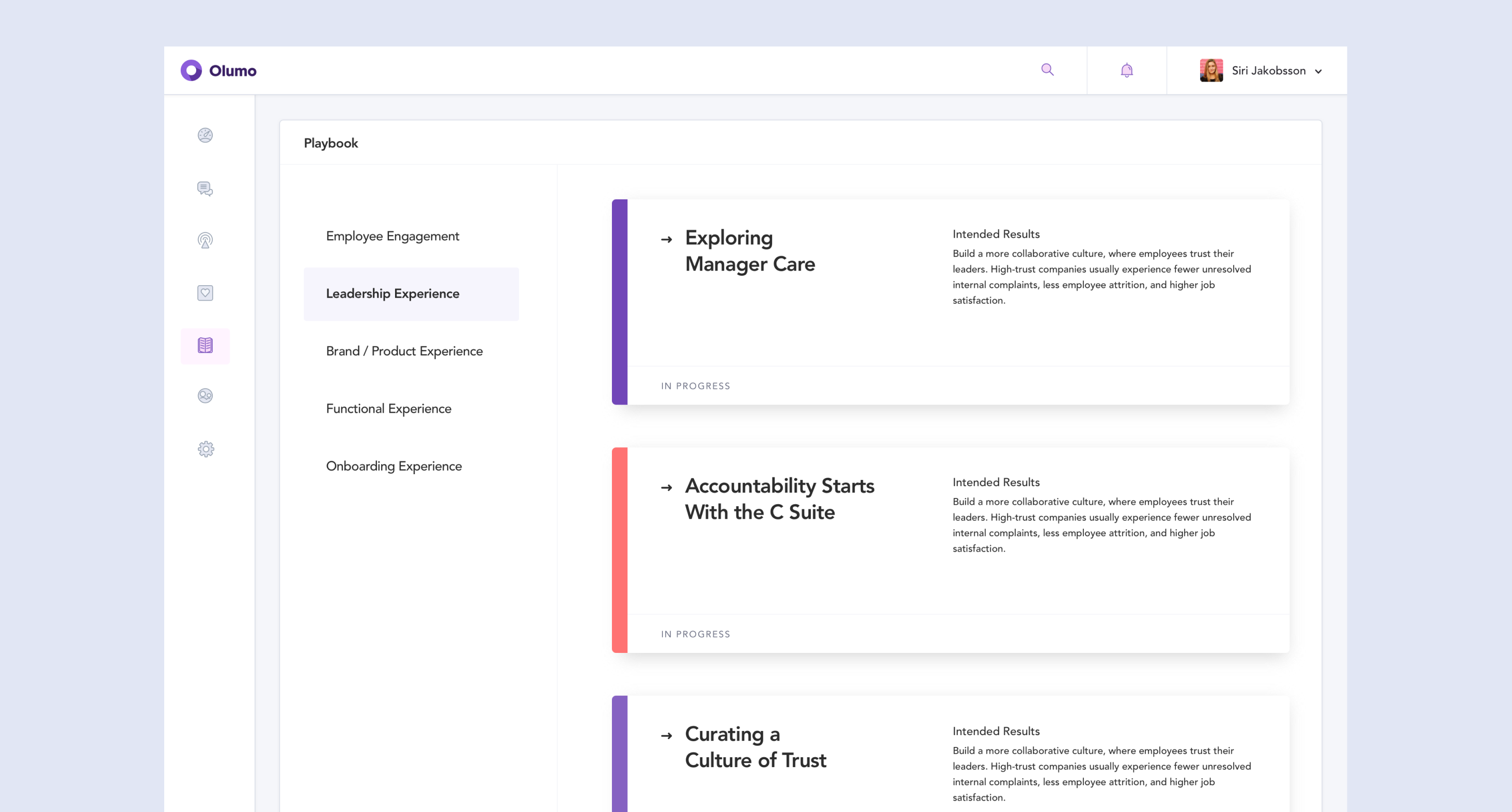 Even with clearer data, many leaders weren't sure how to act on low metrics. We solved this by creating interactive playbooks, guides that identified struggling areas and provided step-by-step improvement plans. Each playbook combined expert coaching, best practices, and prompted follow-up surveys to track progress. This evolved into one of Olumo's defining features.