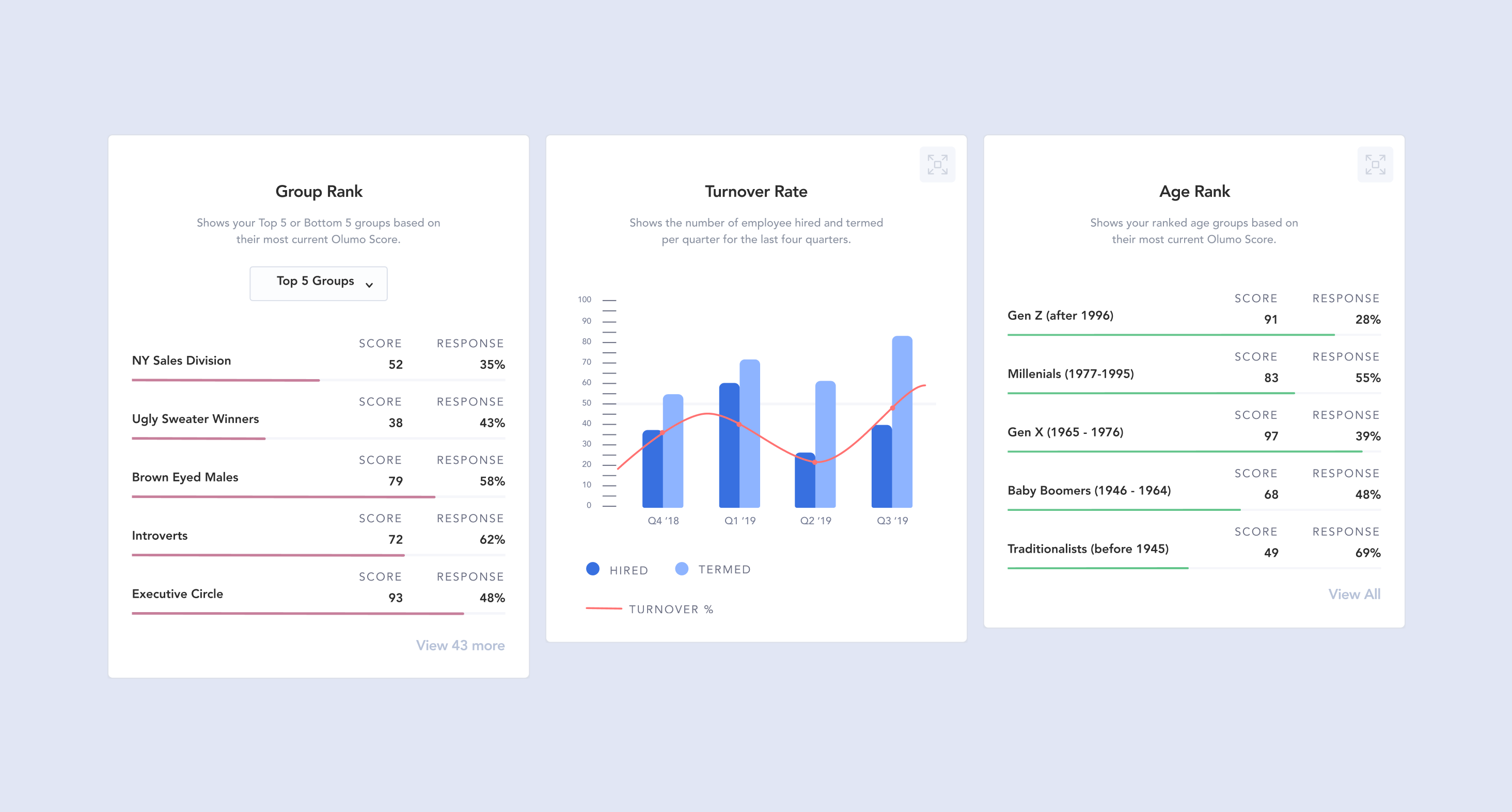 Olumo's MVP revealed a critical gap: customers were drowning in employee feedback data but lacked clear paths to action. Leaders received survey results showing scores between 1 and 100 for ambiguous metrics, leaving them confused rather than empowered. Our mission became clear: transform raw data into confident decision-making.